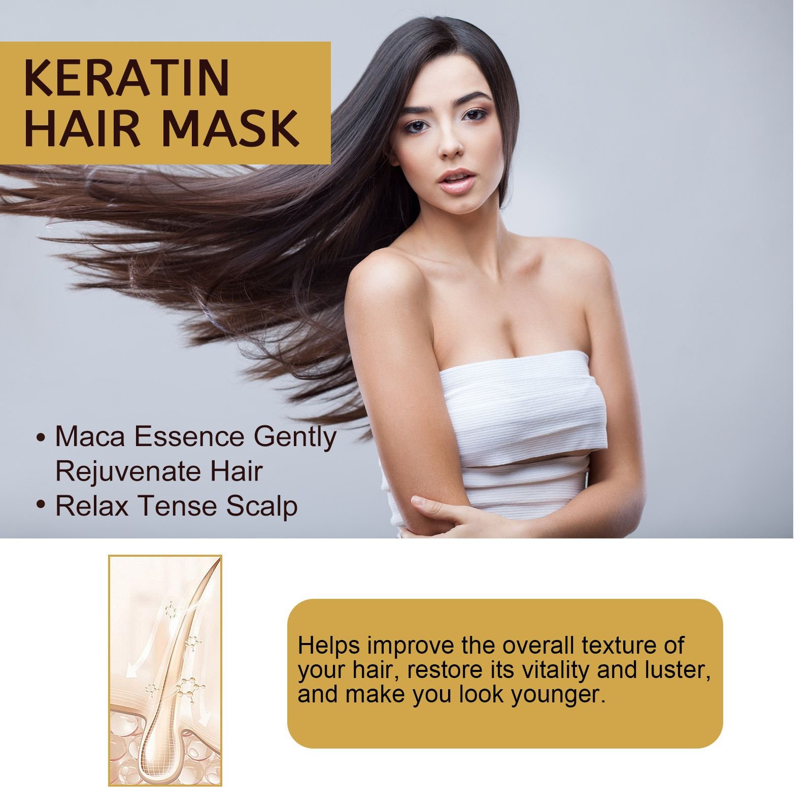 Our restorative moisturizing hair mask contains keratin, collagen. It can deeply moisturize hair, improve hair quality, quickly repair damaged hair, safe ingredients, easy to absorb. Its use method is very simple: wash and dry the hair, apply appropriate amount of this product to the hair root to the tip, wait 10 minutes, and then rinse with water. And it can help improve the overall texture of your hair, restore vitality and shine to your hair, and make you look younger.